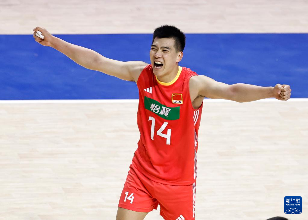 6月27日,中国队主攻翟德军在比赛中庆祝得分。