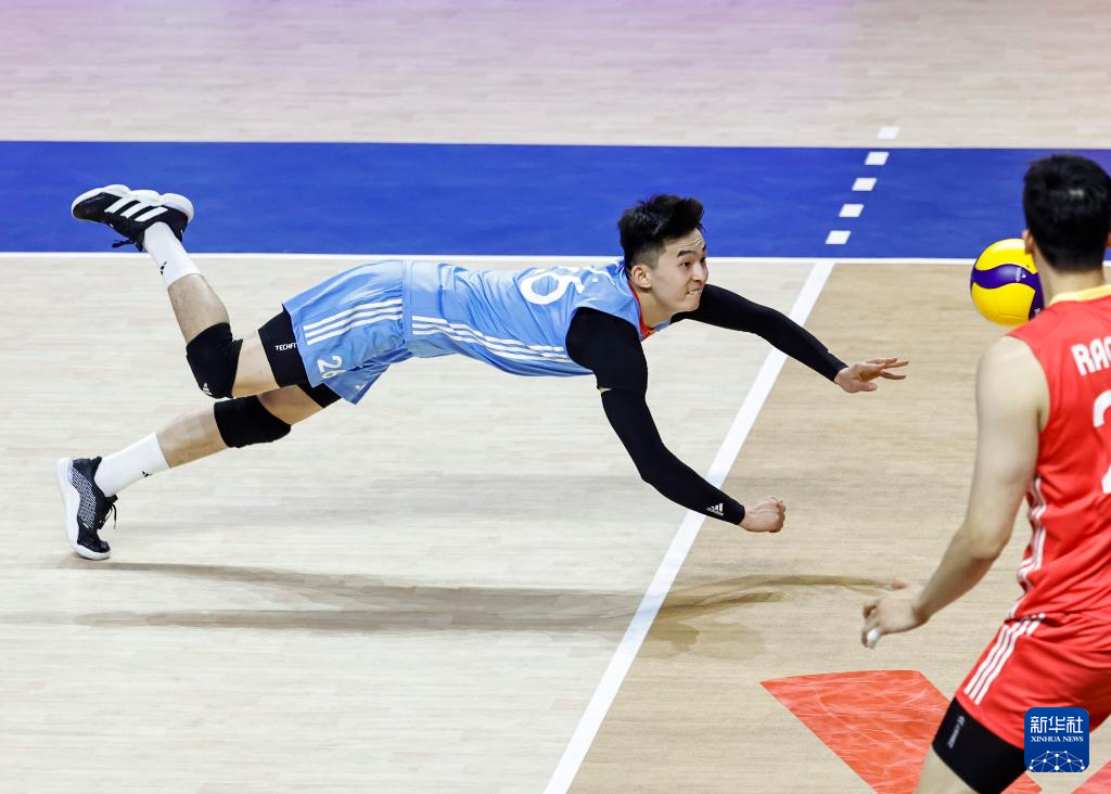 6月27日,中国队球员翟德军(右)在比赛中垫球。