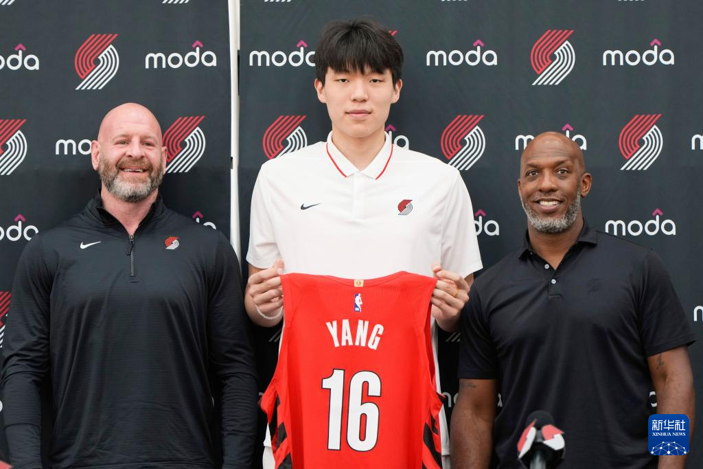 6月27日,杨瀚森(中)在发布会上展示自己的开拓者队球衣。