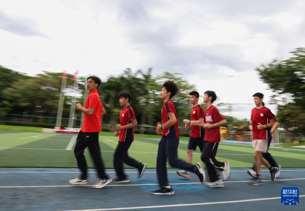 图为广东现代五项运动协会教练员滕泽华(左一)带领广州市中黄港澳子弟学校学生进行慢跑训练(6月19日摄)。新华社记者 肖恩楠 摄