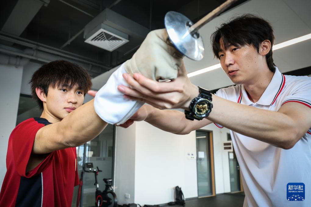 图为广东现代五项运动协会教练员肖勇炫(右)纠正广州市中黄港澳子弟学校港籍生张嗣涛击剑技术细节(6月19日摄)。新华社记者 肖恩楠 摄