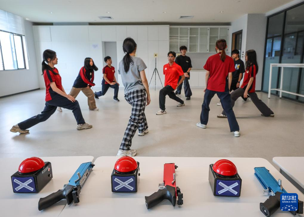 图为学生们在广州市中黄港澳子弟学校运动室进行射击训练(6月19日摄)。新华社记者 肖恩楠 摄