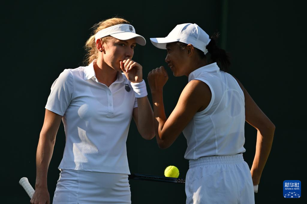 7月2日,张帅(右)/亚历山德罗娃在比赛中交流。新华社记者 赵丁喆 摄