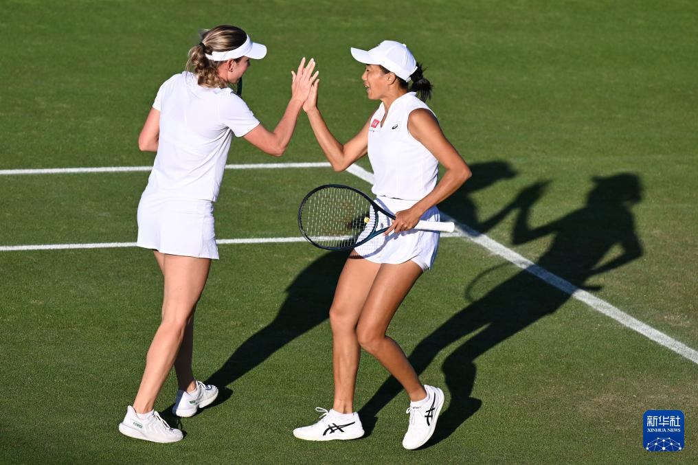 7月2日,张帅(右)/亚历山德罗娃在比赛中击掌。新华社记者 赵丁喆 摄