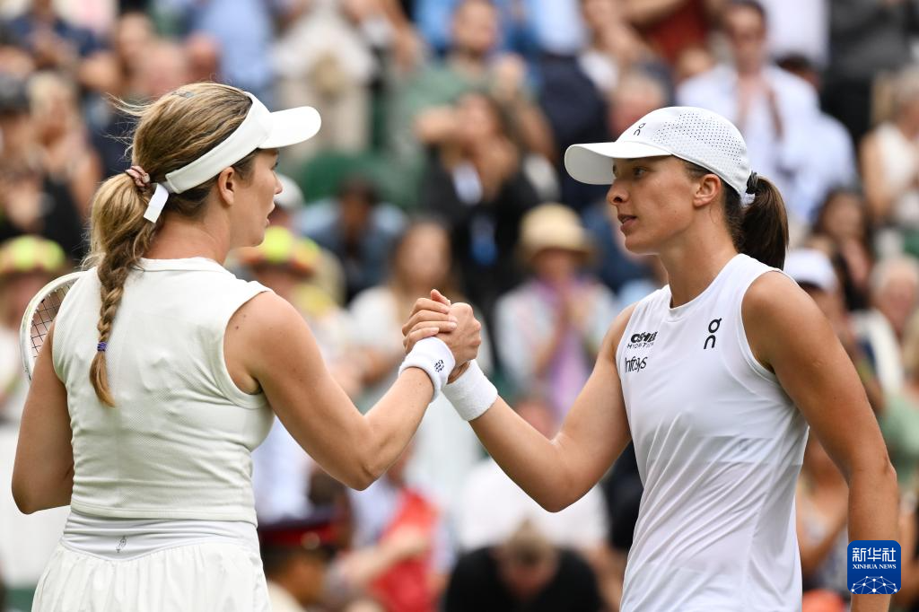 7月5日,斯维亚特克(右)在比赛后与柯林斯握手致意。