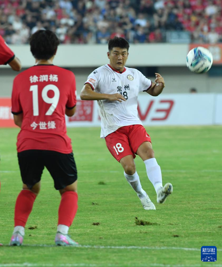 7月6日,常州队球员谢晖阳(右)在比赛中进攻。新华社发(刘臻睿摄)