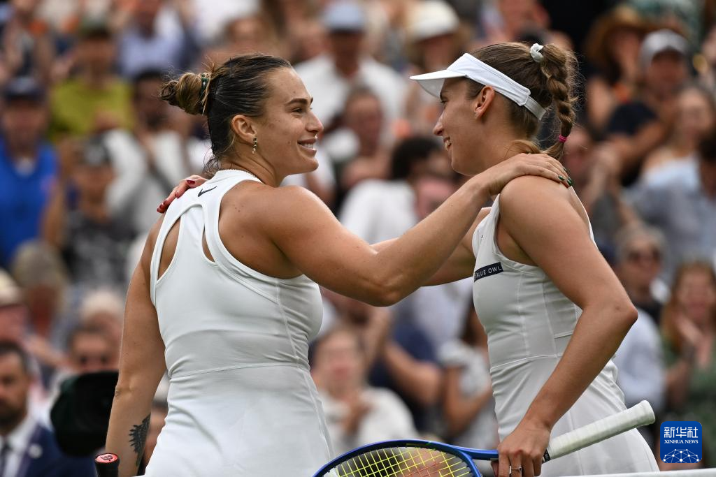 7月6日,萨巴伦卡(左)与梅尔滕斯在比赛后相互致意。新华社记者 赵丁喆 摄