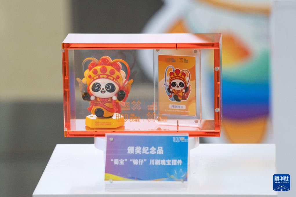 这是7月8日拍摄的成都世运会颁奖纪念品——“蜀宝”“锦仔”川剧瑰宝摆件。“蜀宝”“锦仔”以川剧变脸艺术为灵感,创新设计双面一体背对背的玩偶。新华社发(陈居伟摄)