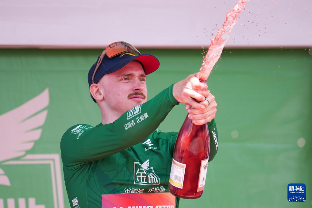 7月9日,李宁之星车队车手亚历山大·谢尔比身着代表冲刺总积分第一名的绿衫在领奖台上庆祝。新华社记者 齐芷玥 摄
