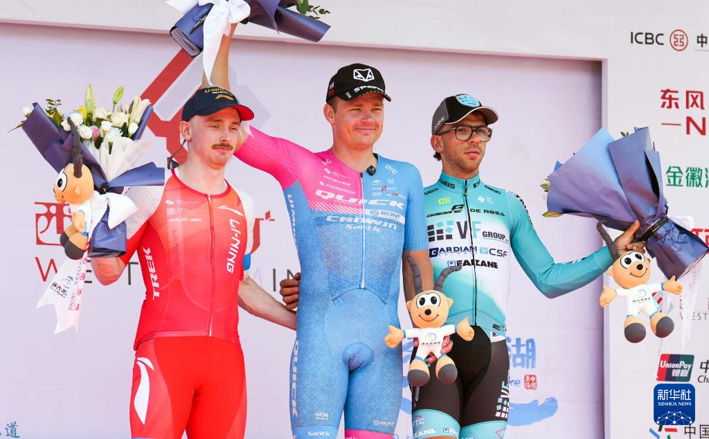7月9日,赛段冠军爱沙尼亚快客车队车手马丁·拉亚斯(中)、亚军李宁之星车队车手亚历山大·谢尔比(左)、季军意大利巴迪亚尼车队车手恩洛科·扎农塞洛在领奖台上合影。新华社记者 齐芷玥 摄