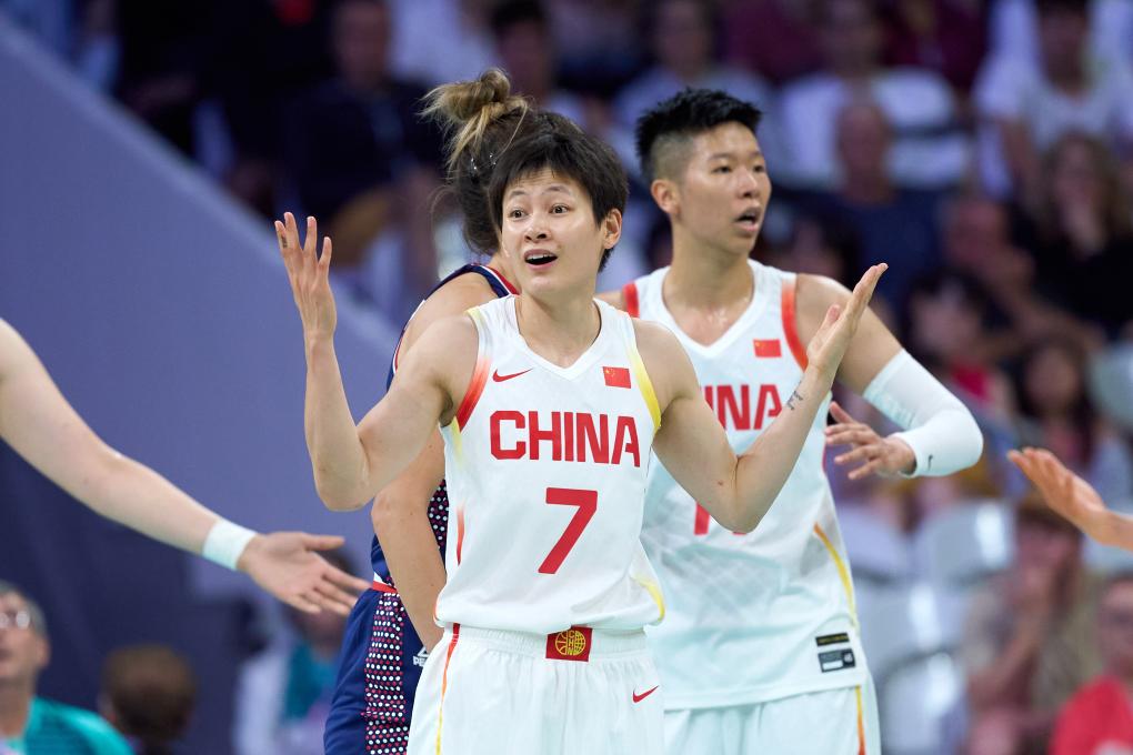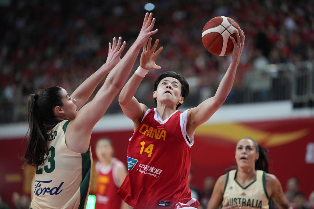 7月8日,中国队球员杨舒予(中)在与澳大利亚队的热身赛中突破。新华社记者 薛宇舸 摄