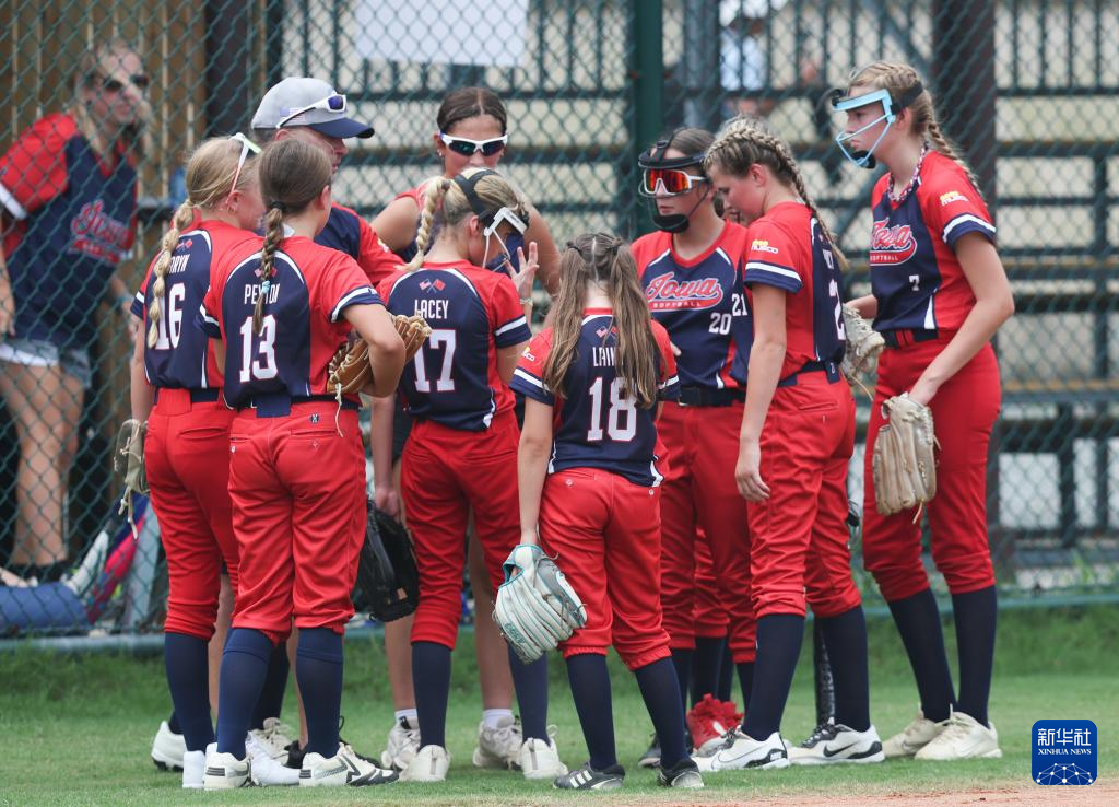 7月14日,美国艾奥瓦闪电队球员在场边交流。