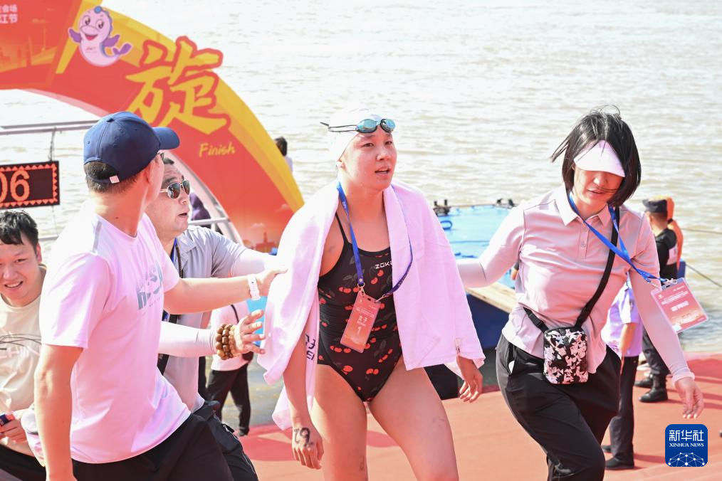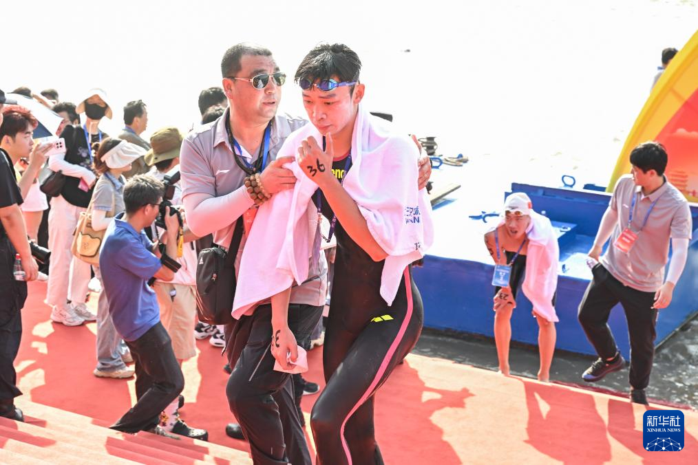 7月16日,参加女子抢渡赛的选手夏紫璇(中)在登岸后。最终,她以12分53秒15的成绩获得女子组冠军。新华社记者 肖艺九 摄