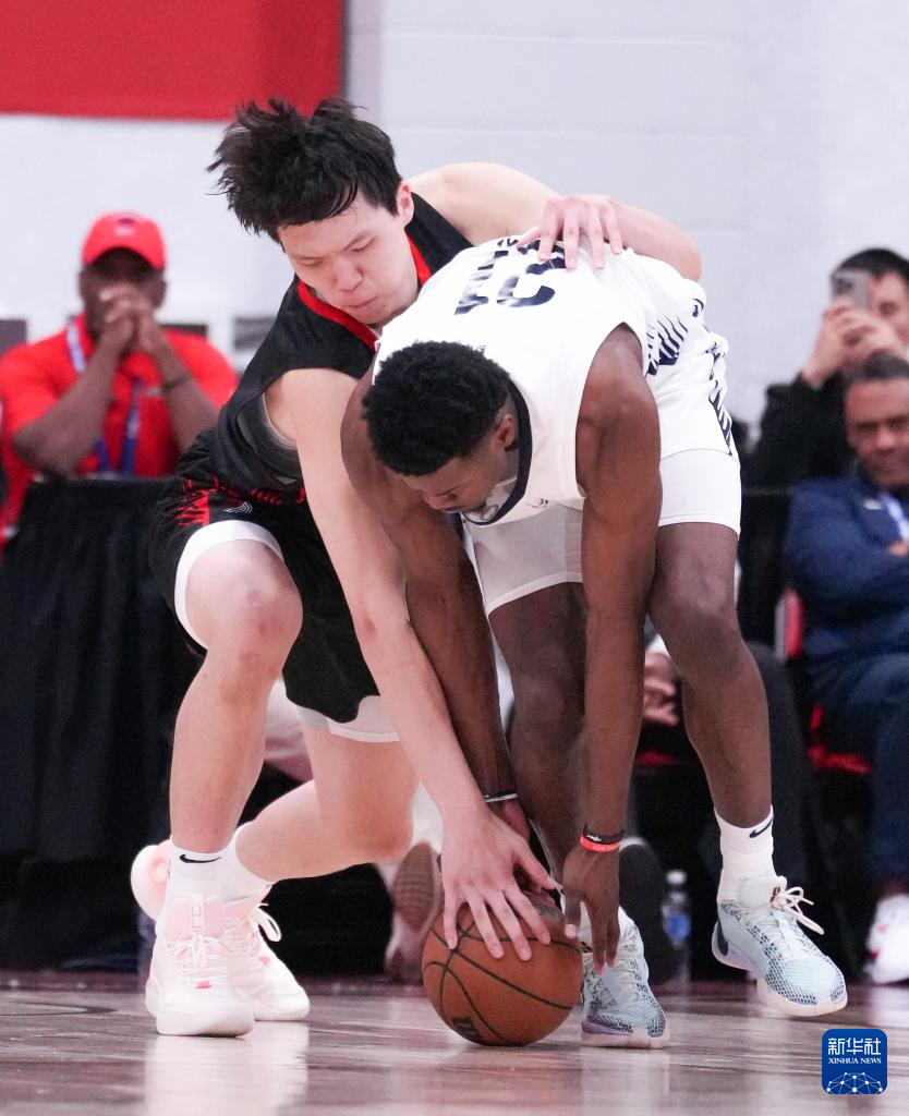 7月15日,开拓者球员杨瀚森(左)在比赛中争抢。新华社发(孙宇轩摄)
