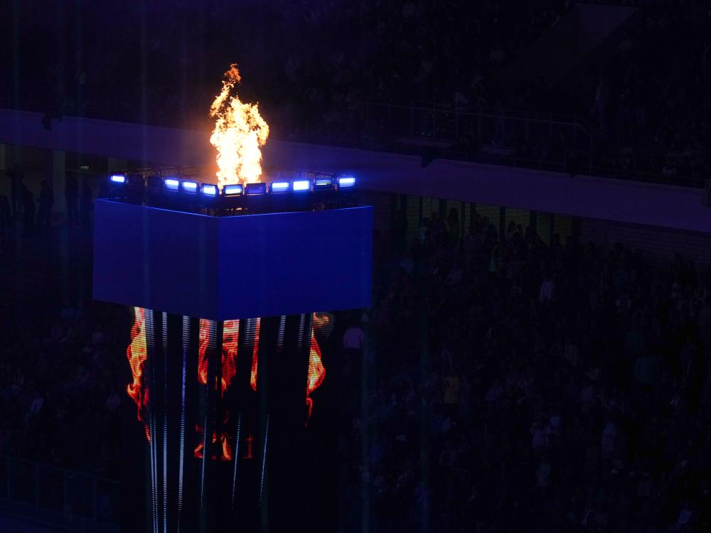 在点燃圣火环节,曾在1972年慕尼黑奥运会摘得两金一银的德国运动员罗森达尔手持火炬入场,六根“烟囱”又转为“灯塔”,被六名运动员同时点燃。此时,体育场顶棚的烟花升起,照亮杜伊斯堡的墨色苍穹,将整个开幕式推向高潮。随后,圣火被收集进六个小矿灯当中,由本次大运会的六个举办城市分别保存。