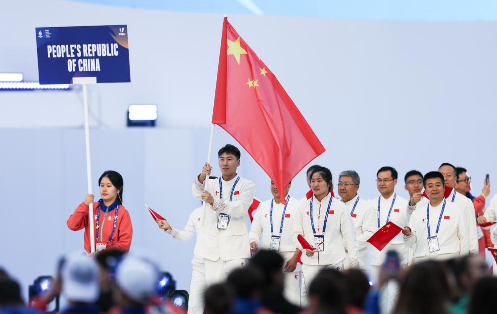 当晚,在刘贝、崔赫宸两位旗手的引领下,中国大学生体育代表团入场。此次大运会,中国代表团由二百余人组成,将参加羽毛球、篮球、排球等14个大项、90余个小项的比赛。