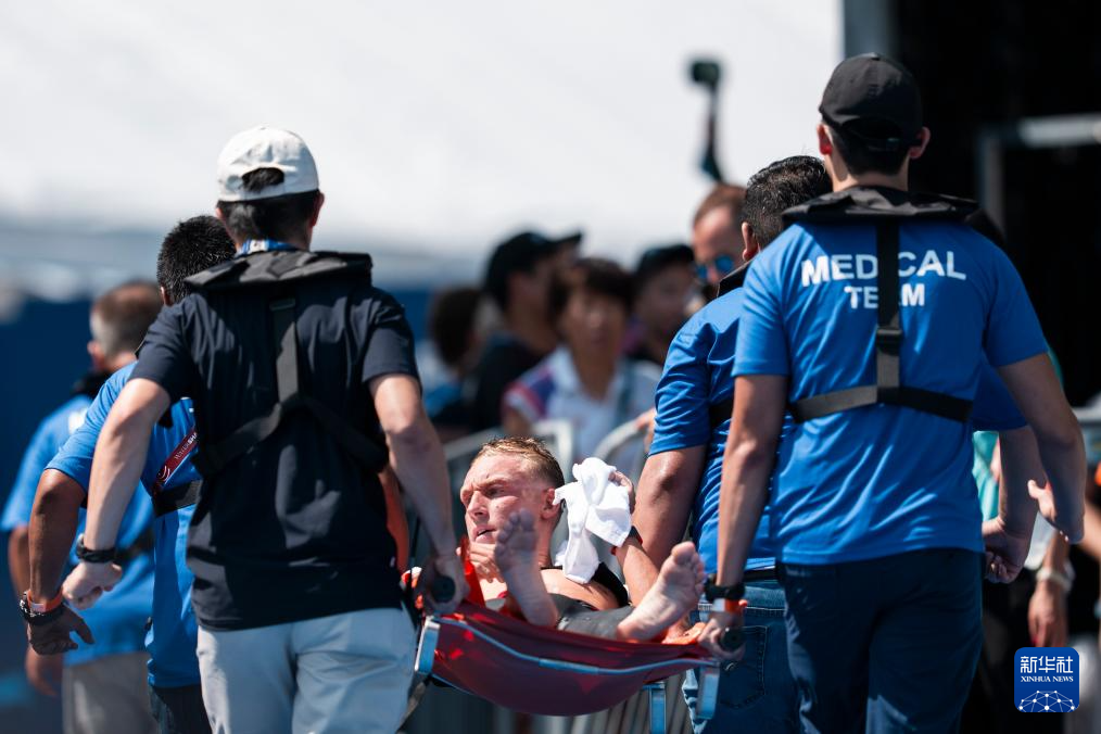 7月16日,法国选手奥利维耶(中)在比赛中接受救援。他因身体原因未完赛。新华社记者 伍志尊 摄