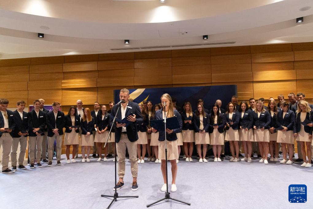 7月17日,运动员在匈牙利代表团誓师大会上宣誓。新华社发(弗尔季·奥蒂洛摄)