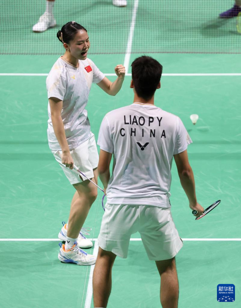 7月18日,中国队组合廖品逸/李茜(左)在混双比赛中庆祝得分。新华社记者 胡星宇 摄