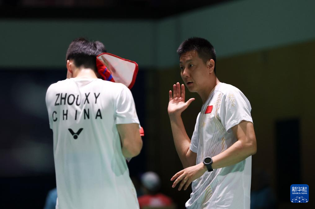 7月18日,中国队教练陈金(右)在比赛间隙指导中国队选手周新宇。新华社记者 胡星宇 摄