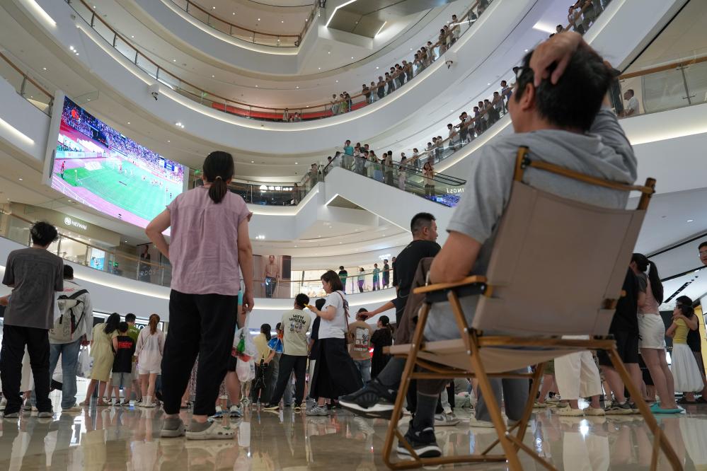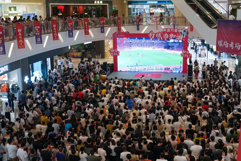 6月29日,市民、球迷在南通市内一处商场观看比赛直播,为球队加油呐喊。“苏超”(2025江苏省城市足球联赛)第五轮南通队坐镇主场对阵宿迁队。