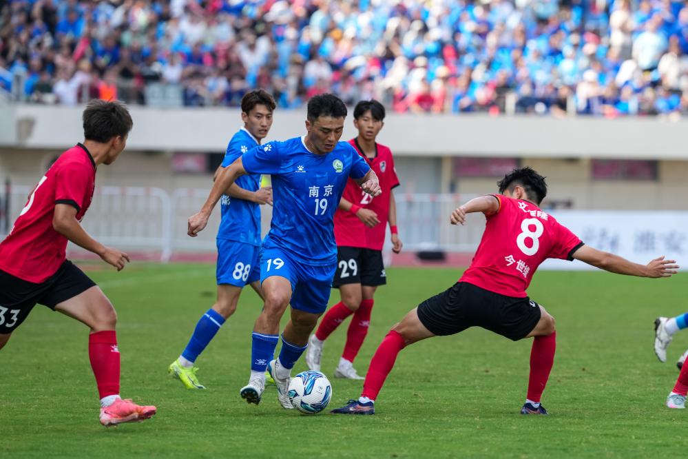 6月14日,南京队球员唐淼(左三)在比赛中突破。在江苏省淮安市举行的2025江苏省城市足球联赛第四轮比赛中,淮安队主场1比1战平南京队。