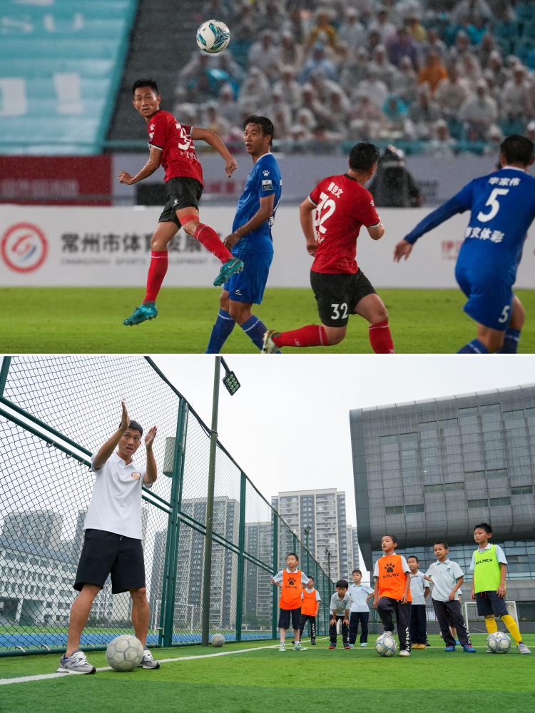 拼版照片:上图为6月21日,常州队球员卢志勇(左一)在“苏超”第五轮对阵南京队的比赛中;下图为6月22日,常州市钟楼区昕弘实验学校的体育老师卢志勇在学校内指导校队球员进行训练。