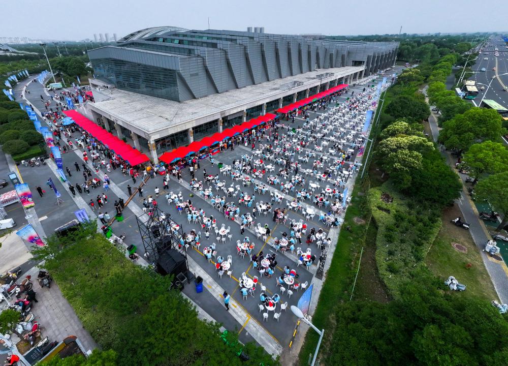 这是6月14日拍摄的江苏淮安“苏超”市集。江苏省淮安市以“激情夏日 乐享足球”为主题,在江苏省城市足球联赛第四轮淮安队对阵南京队比赛期间,在淮安奥体中心周边打造集美食体验、购物休闲、娱乐互动、文化传播为一体的淮安主场比赛配套市集,营造热烈的赛事氛围,提升赛事附加值。
