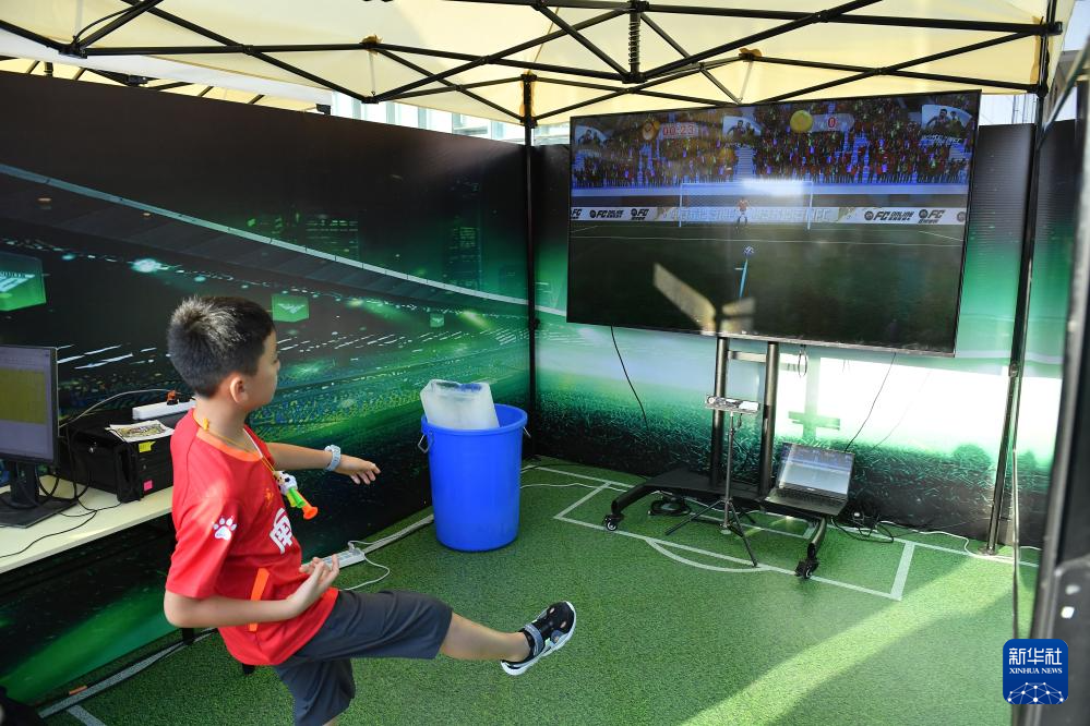 7月19日,在赛场外,一名小球迷在体验虚拟足球。