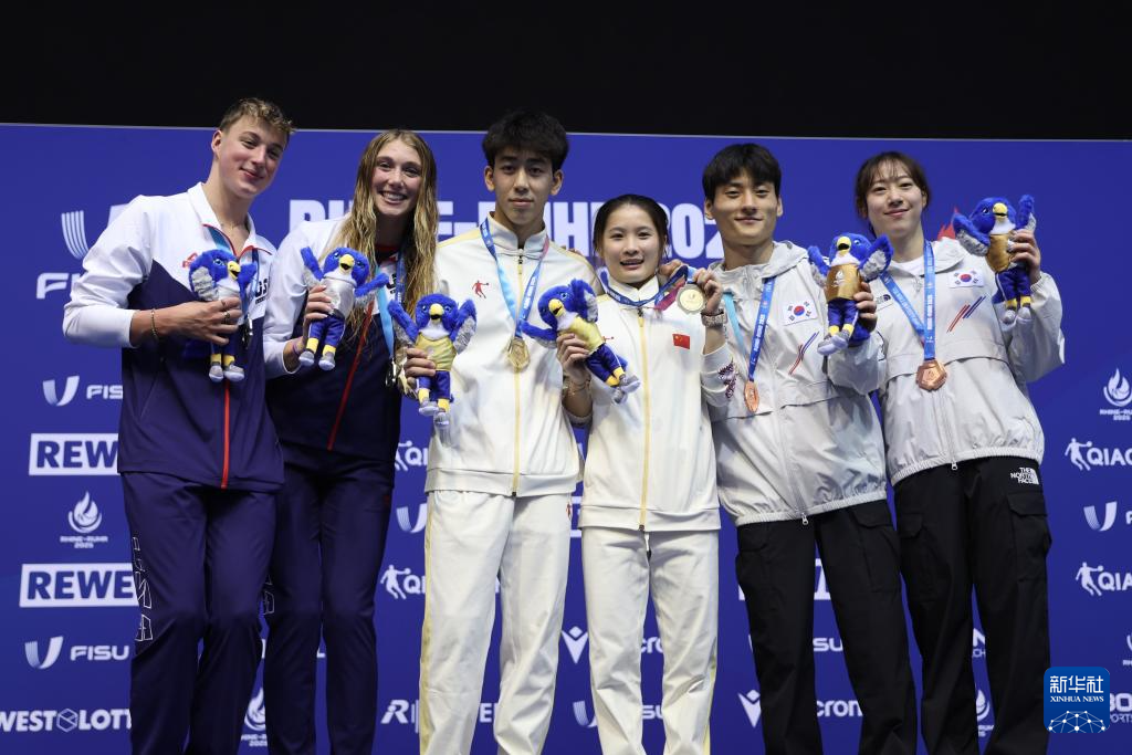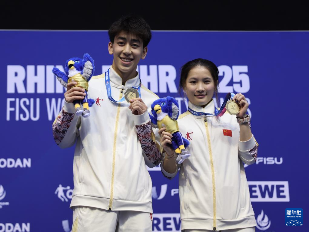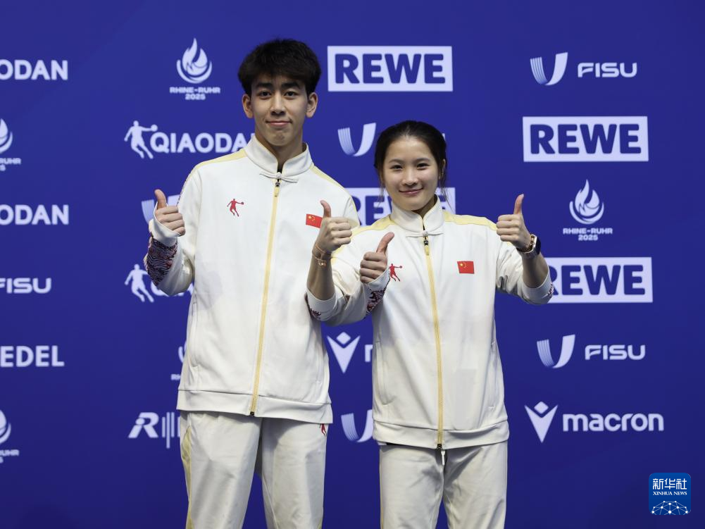 当日,在德国柏林举行的2025年莱茵-鲁尔世界大学生夏季运动会混合双人十米台决赛中,中国组合郑钧之/王伟莹获得冠军。