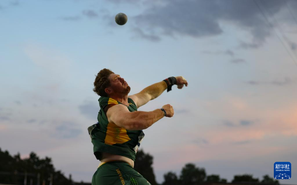 7月24日,南非选手史密斯在比赛中试投后庆祝。最终,他获得冠军。新华社记者 胡星宇 摄