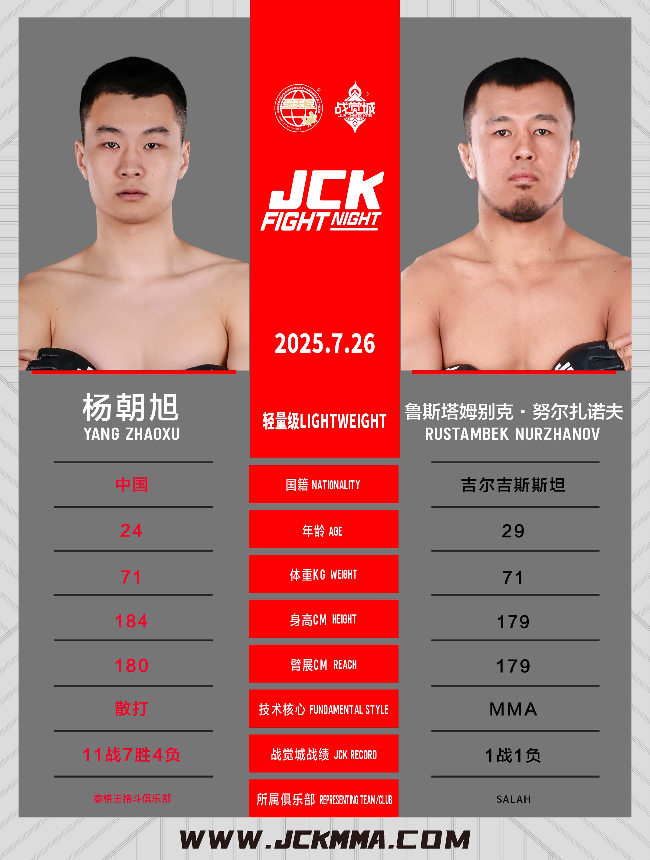 杨朝旭,JCK战觉城轻量级官方排名第五,目前在JCK战觉城11战7胜,曾首回合TKO田袭,一致判定战胜李恒远、杨国旭,第二回合TKO刘永强、布雷诺·马里尼奥,KO杨飞。