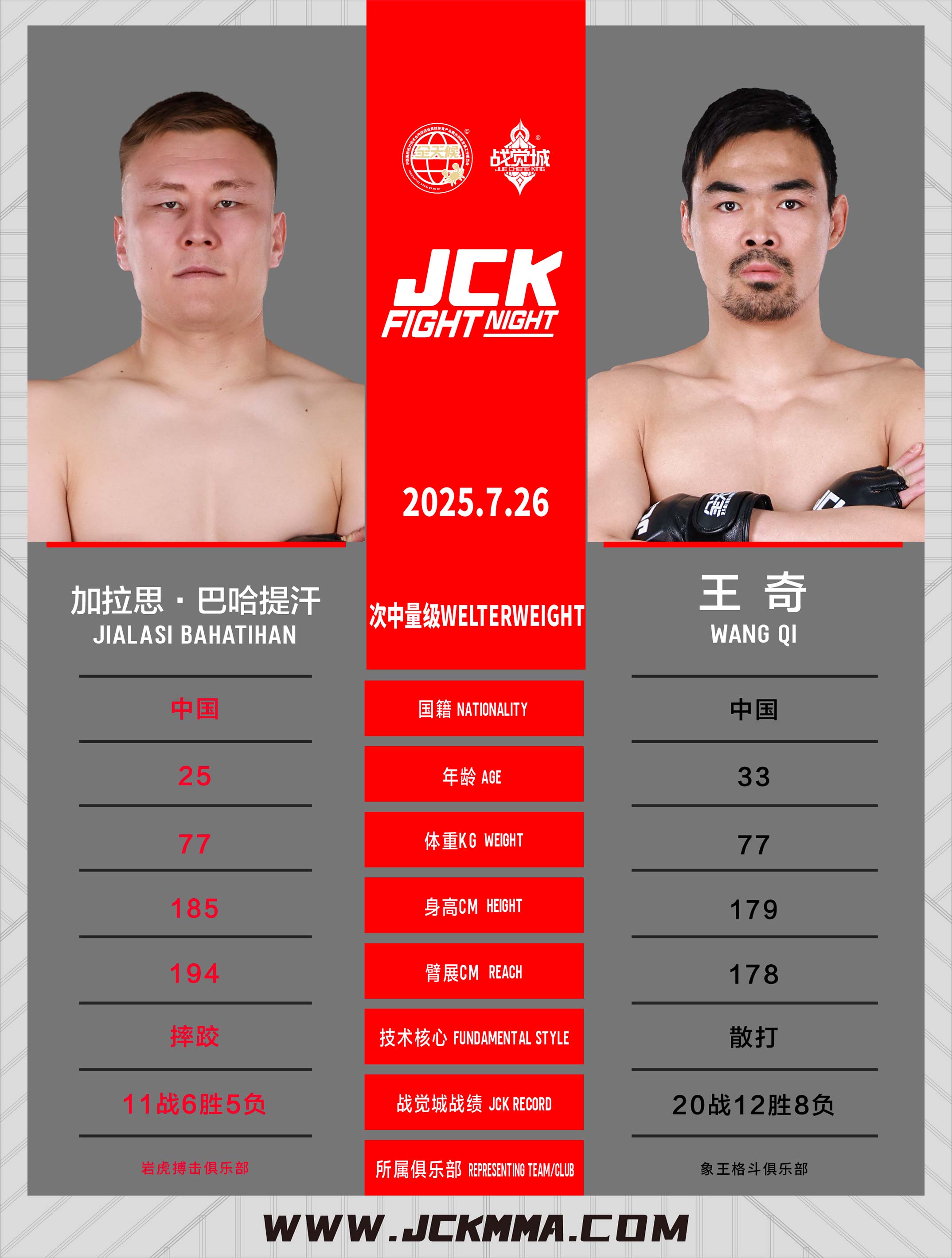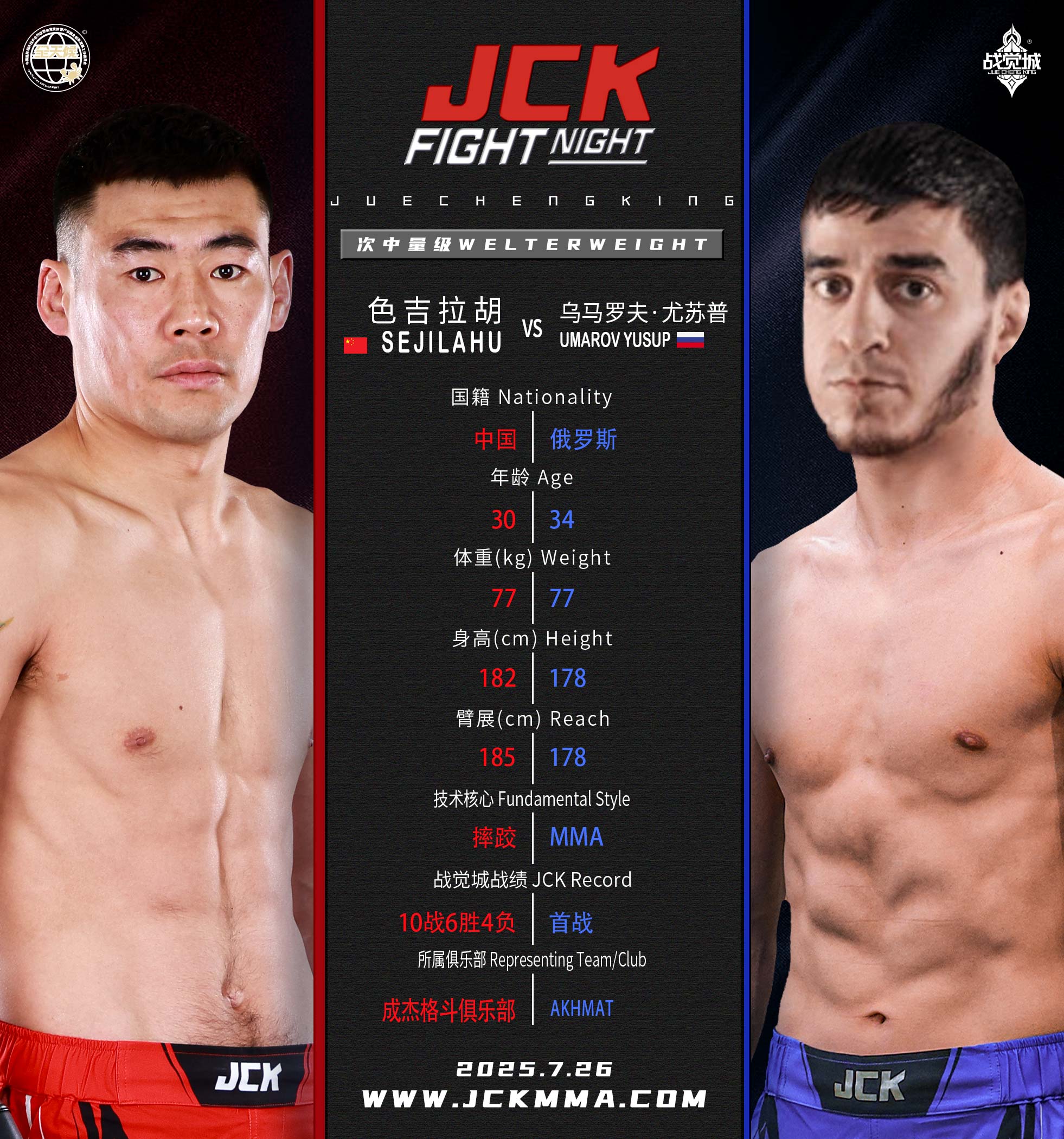 2025年7月26日,JCK觉城之夜N102将于JCK战觉城国际格斗中心开战,头条主赛色吉拉胡VS乌马罗夫·尤苏普,联合主赛加拉思·巴哈提汗VS王奇,正赛部分杨朝旭VS鲁斯塔姆别克·努尔扎诺夫、罗周江措VS哈斯铁尔·萨尔科特别克、特丹让俄VS胡兰·巴特尔艾力。