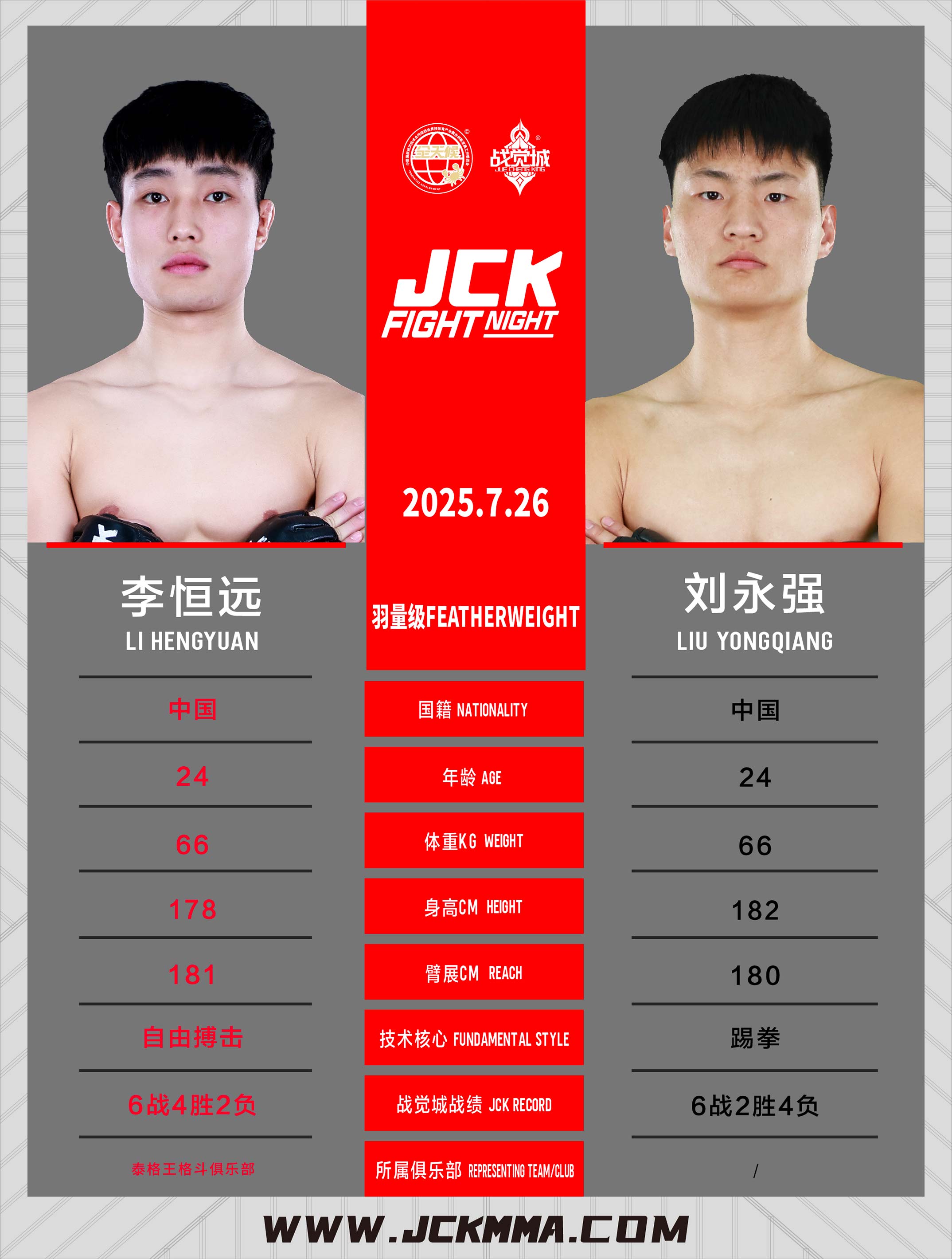 刘永强,JCK觉城之夜N76四人新锐赛冠军,目前在JCK战觉城6战2胜,曾圈臂断头降服钟振杰,手臂十字固降服肖银锋,目前3连败。