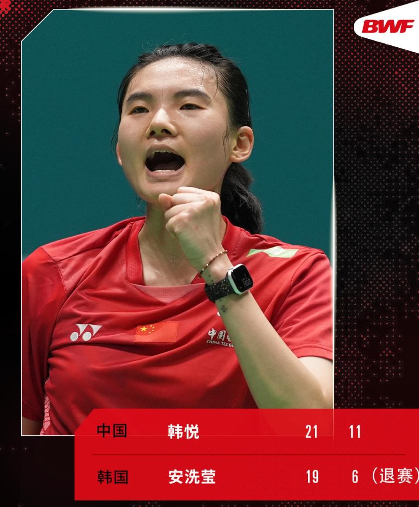 女单半决赛,面对世界第一、韩国名将安洗莹,韩悦毫不手软,以21:19先下一城。第二局韩悦11:6领先时,安洗莹因伤退赛。她解释说比赛一开始就觉得膝盖不太舒服,后来感觉伤势渐重,所以最终决定退赛。