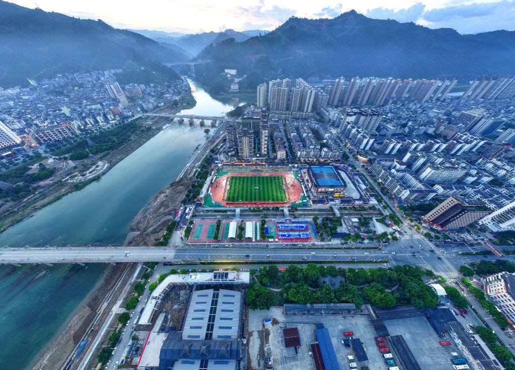 ↑7月25日,洪灾后重建的贵州“村超”球场及榕江县城(无人机照片)。新华社记者 杨文斌 摄