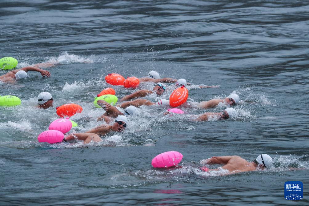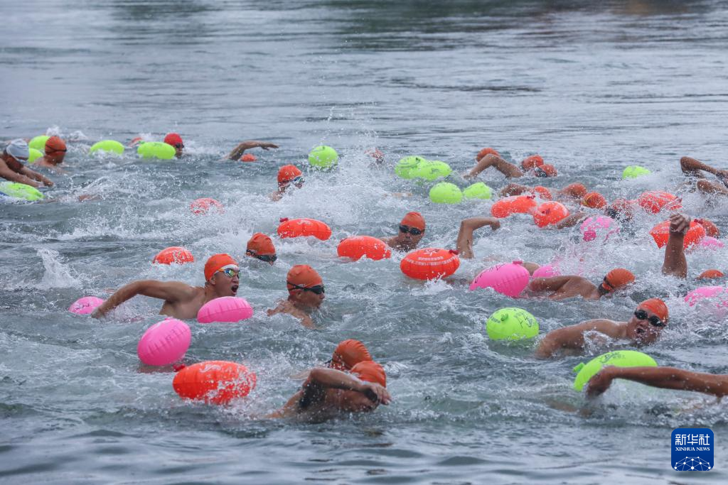 7月27日,参赛选手们跃入新安江中参加“夏日冬泳”。