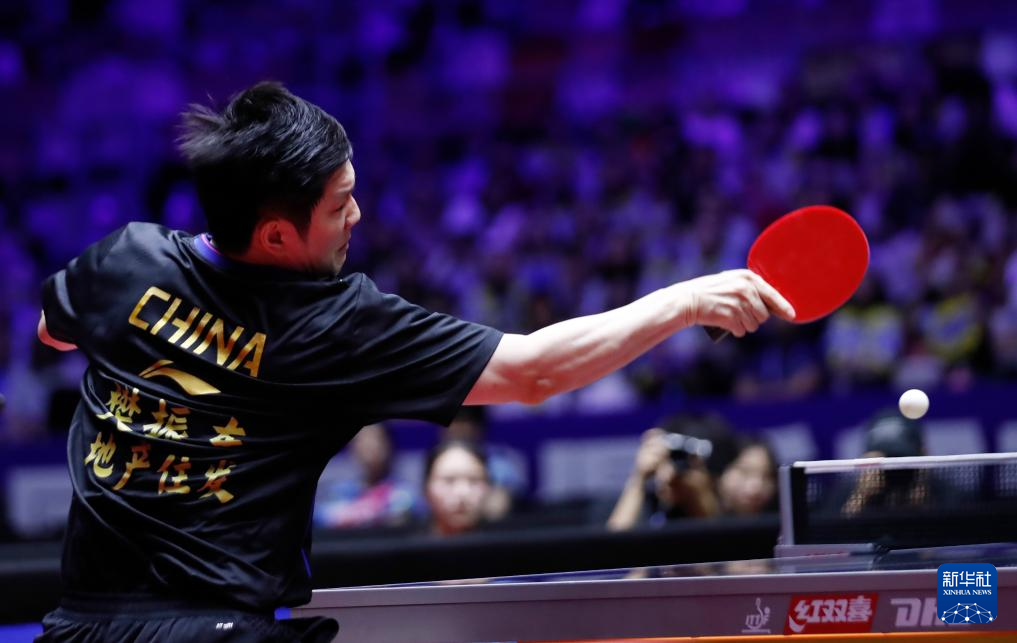 7月27日,上海地产集团队选手樊振东在比赛中回球。他在单打比赛中3比0战胜汕头明润队选手陈垣宇。