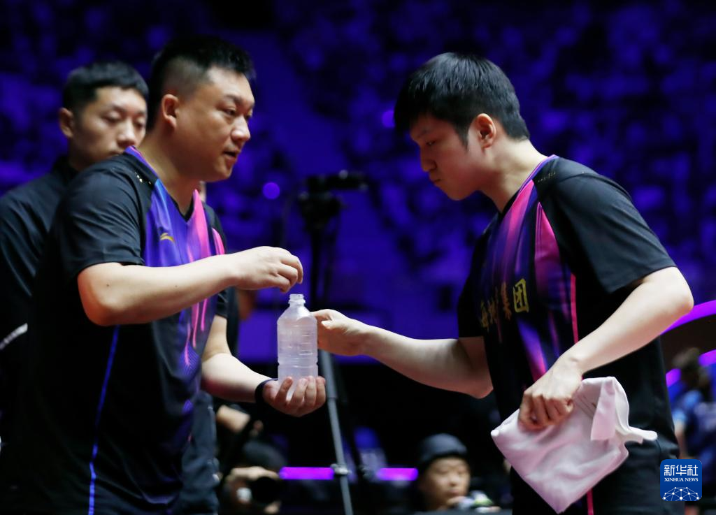 7月27日,上海地产集团队选手樊振东(右)在上场前喝水。最终,他在单打比赛中3比0战胜汕头明润队选手陈垣宇。