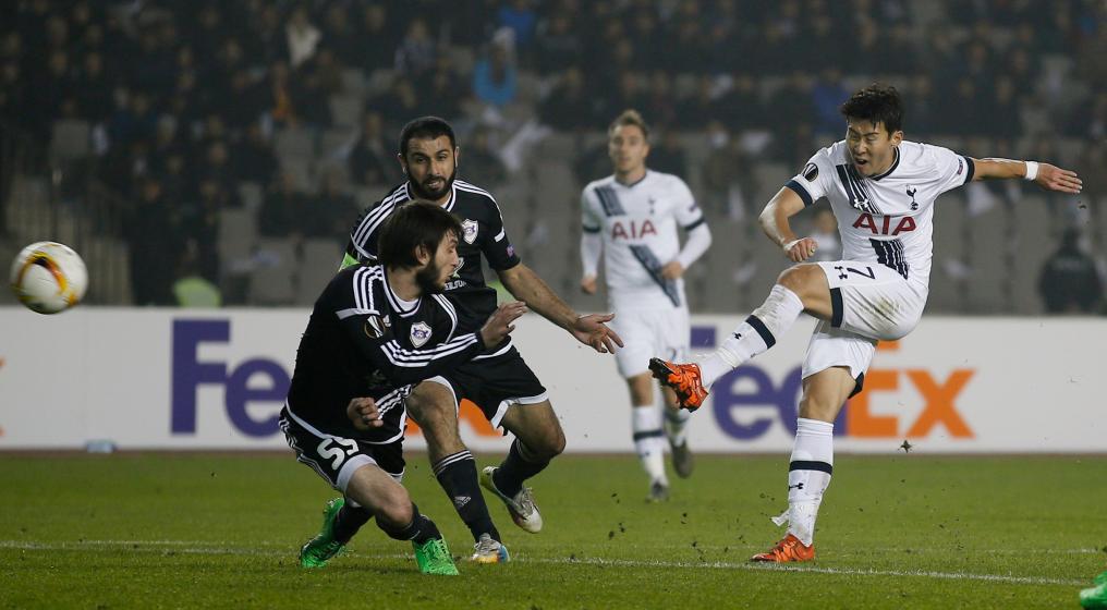 2015年11月26日,热刺队球员孙兴慜(右)在比赛中射门。新华社/路透