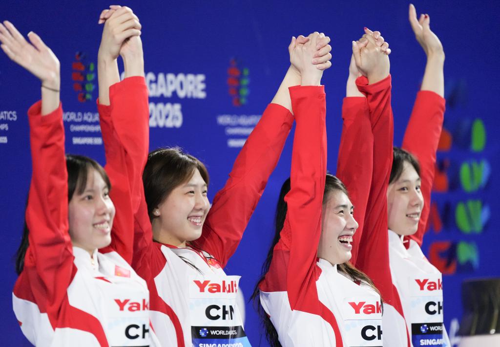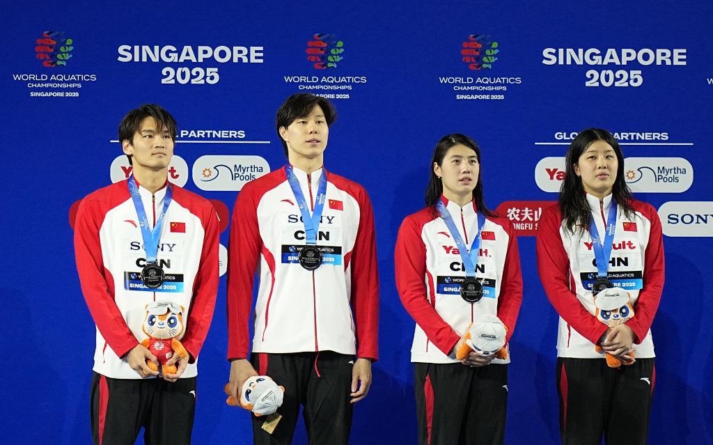 新华社新加坡8月4日电(记者夏亮、周欣、李嘉)3日晚,新加坡游泳世锦赛最后一场比赛,张雨霏和队友在女子4×100米混合泳接力比赛中夺得铜牌。