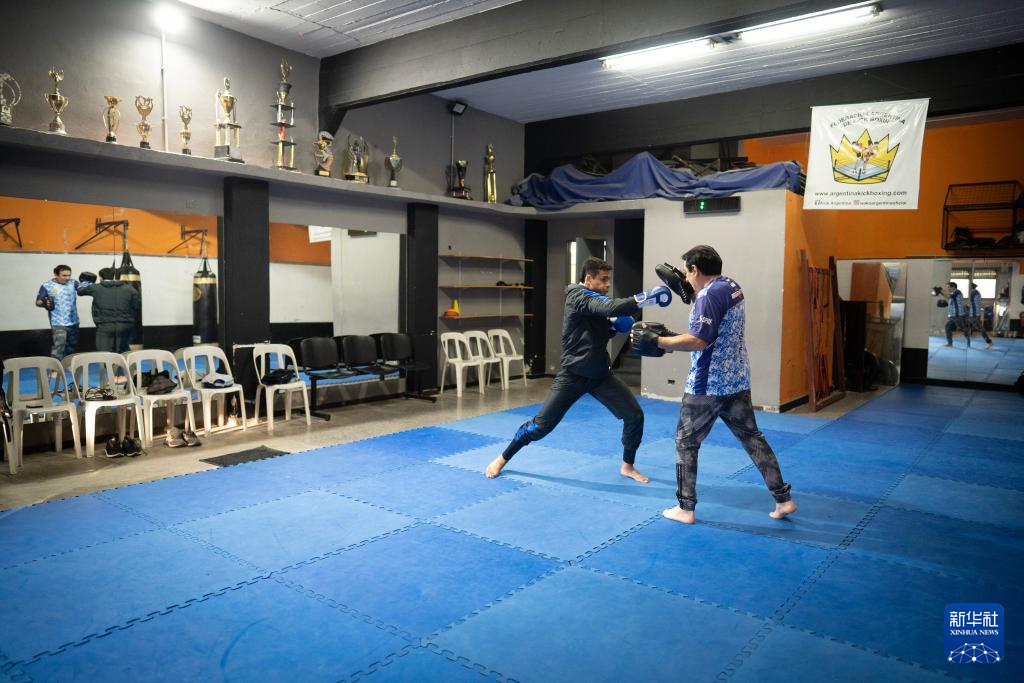 8月5日,在阿根廷布宜诺斯艾利斯,阿根廷自由搏击运动员马蒂亚斯·加西亚(左)在训练。