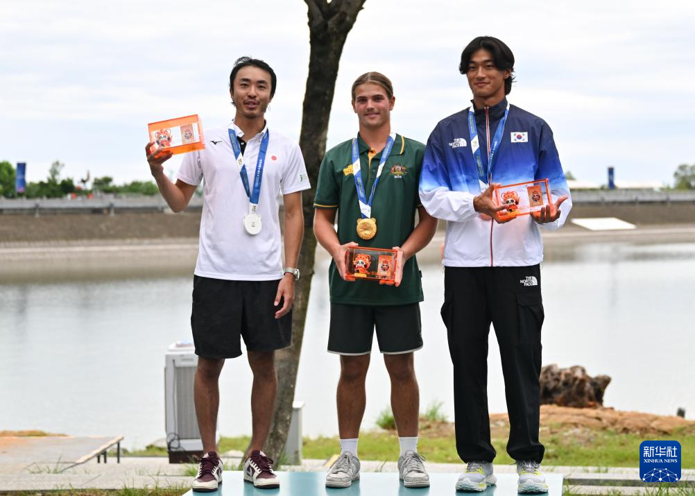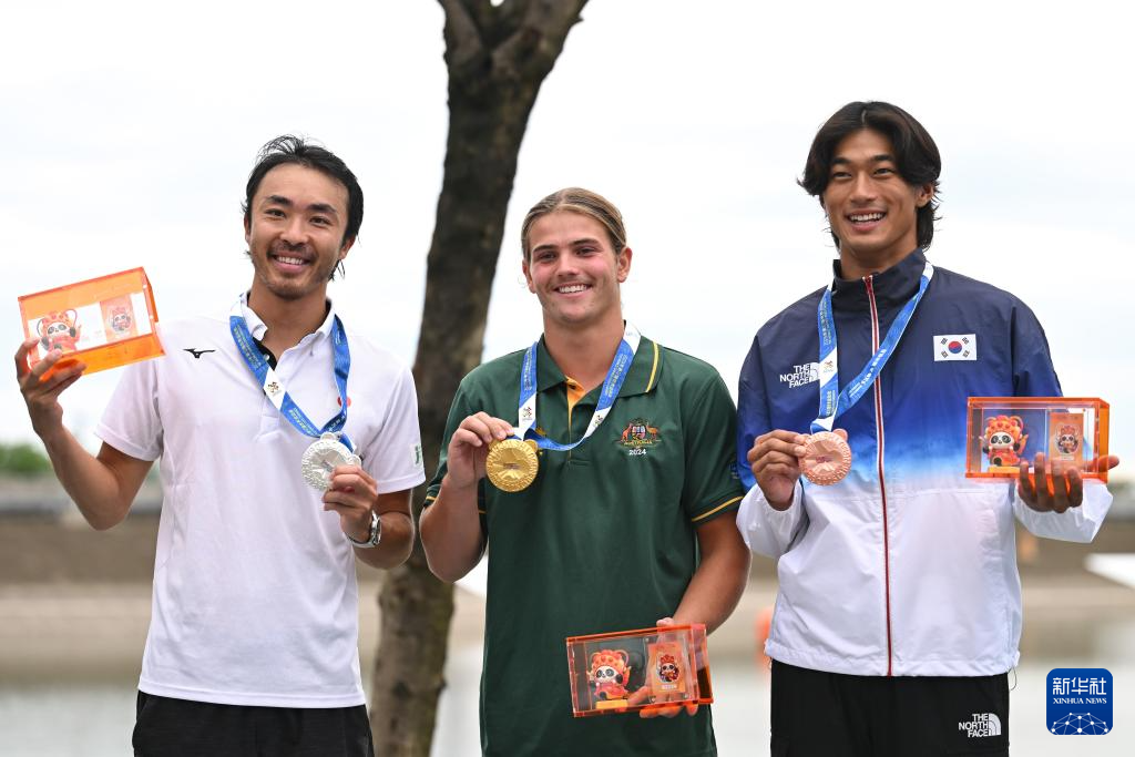 8月10日,冠军澳大利亚选手诺亚·博拉尔德(中)、亚军日本选手手塚翔太(左)和季军韩国选手金允瑞在颁奖仪式上。