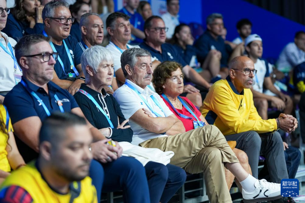 8月11日,国际世界运动会协会主席何塞·佩鲁雷纳(前排中)在场边观赛。