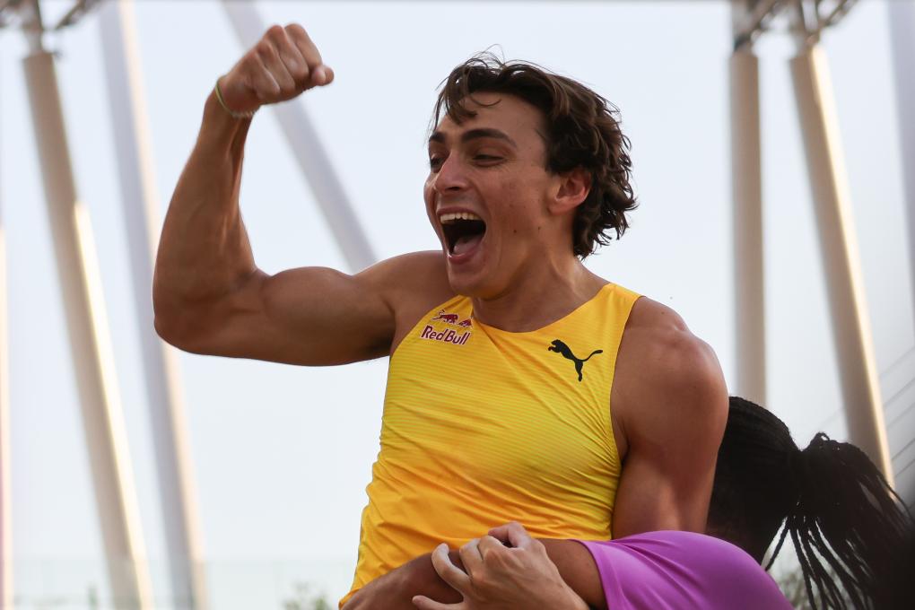 8月12日,杜普兰蒂斯打破世界纪录后庆祝。新华社发(弗尔季·奥蒂洛摄)