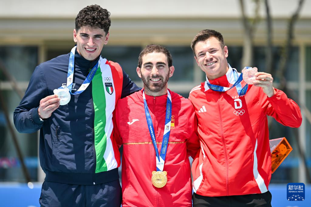 8月13日,冠军西班牙队选手古斯曼(中)、亚军意大利队选手马约尔卡(左)和季军德国队选手罗恩在颁奖仪式上。