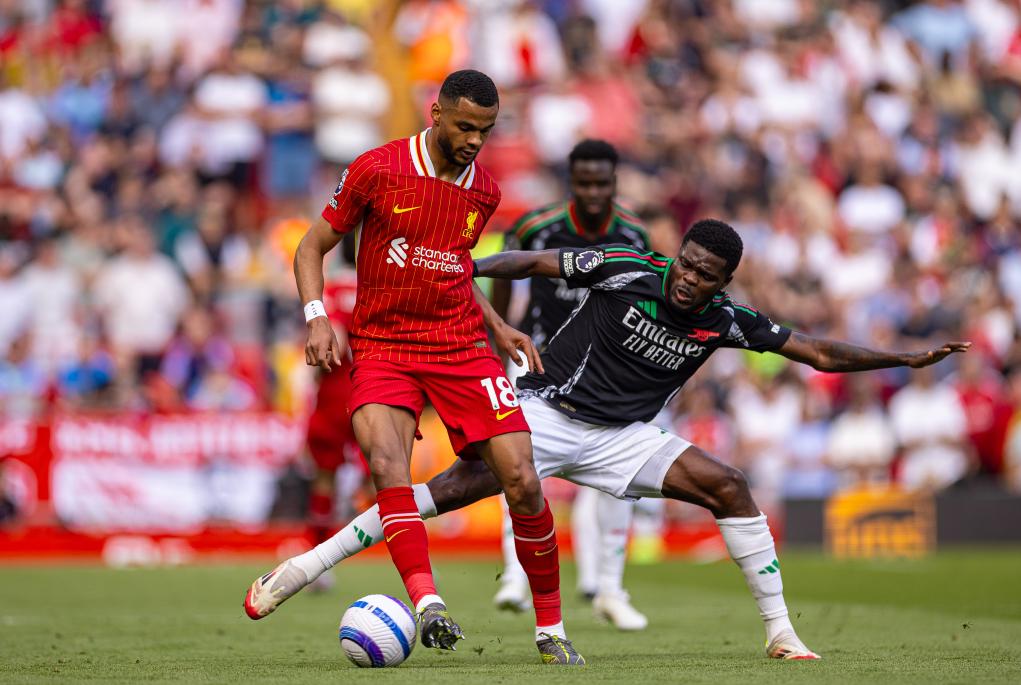 5月11日,阿森纳队球员与利物浦队球员拼抢。当日,在2024-2025赛季英格兰足球超级联赛第36轮比赛中,阿森纳队客场2:2战平利物浦队。新华社发