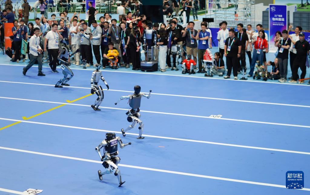 8月14日,工作人员操控机器人在开幕式上开展100米赛跑。
