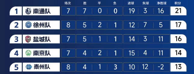 江苏省城市足球联赛目前积分榜前五