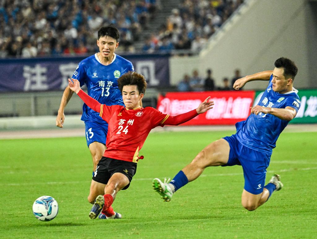 7月5日,苏州队球员寇程(中)在“苏超”比赛中。新华社记者 季春鹏 摄